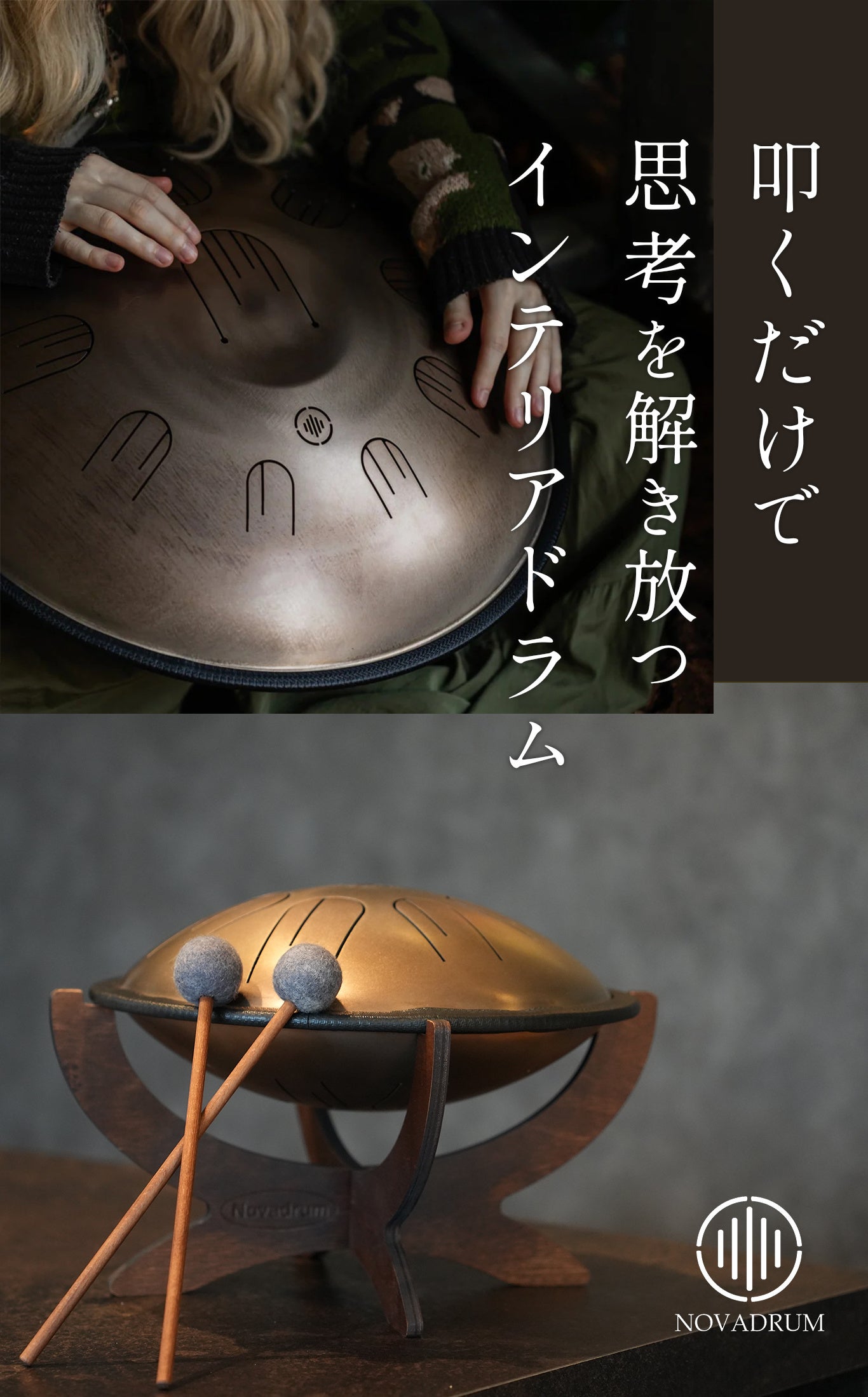 NOVADRUMは、432Hzを基調とした深く澄んだ響きを持ち、リラックスや瞑想、セラピーに最適。