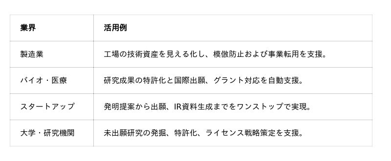 リーガルテック社の知財AIプラットフォームは、すでに多様な業界での導入が進んでいる。各業界の課題に応じた最適化が可能であり、以下のようなユースケースが拡大している。