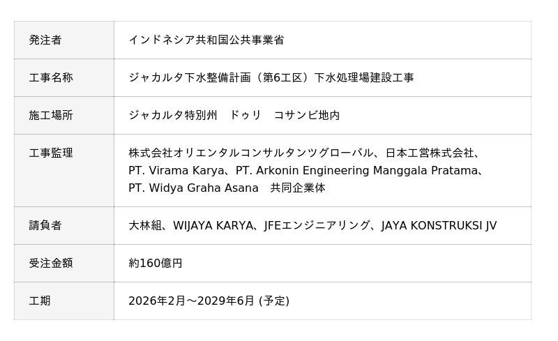 株式会社大林組(本社:東京都港区、社長:佐藤 俊美)、JFEエンジニアリング株式会社(本社:東京都千代田区、社長:福田 一美)、PT. WIJAYA KARYA (Persero), Tbk.(本社:インドネシア共和国、社長:Agung Budi Waskito)およびPT. JAYA KONSTRUKSI MANGGALA PRATAMA, Tbk.(本社:インドネシア共和国、社長:Budi M. Sianipar)は、共同企業体を組成し、インドネシア共和国公共事業省から日本国政府の円借款事業によるジャカルタ下水整備計画(第6工区)下水処理場建設工事(以下、「本工事」)を受注しました。本工事は、ジャカルタ特別州において当共同企業体が2023年に受注し、建設中のジャカルタ下水整備計画(第1工区)下水処理場建設工事[※1]に続くプロジェクトです。
