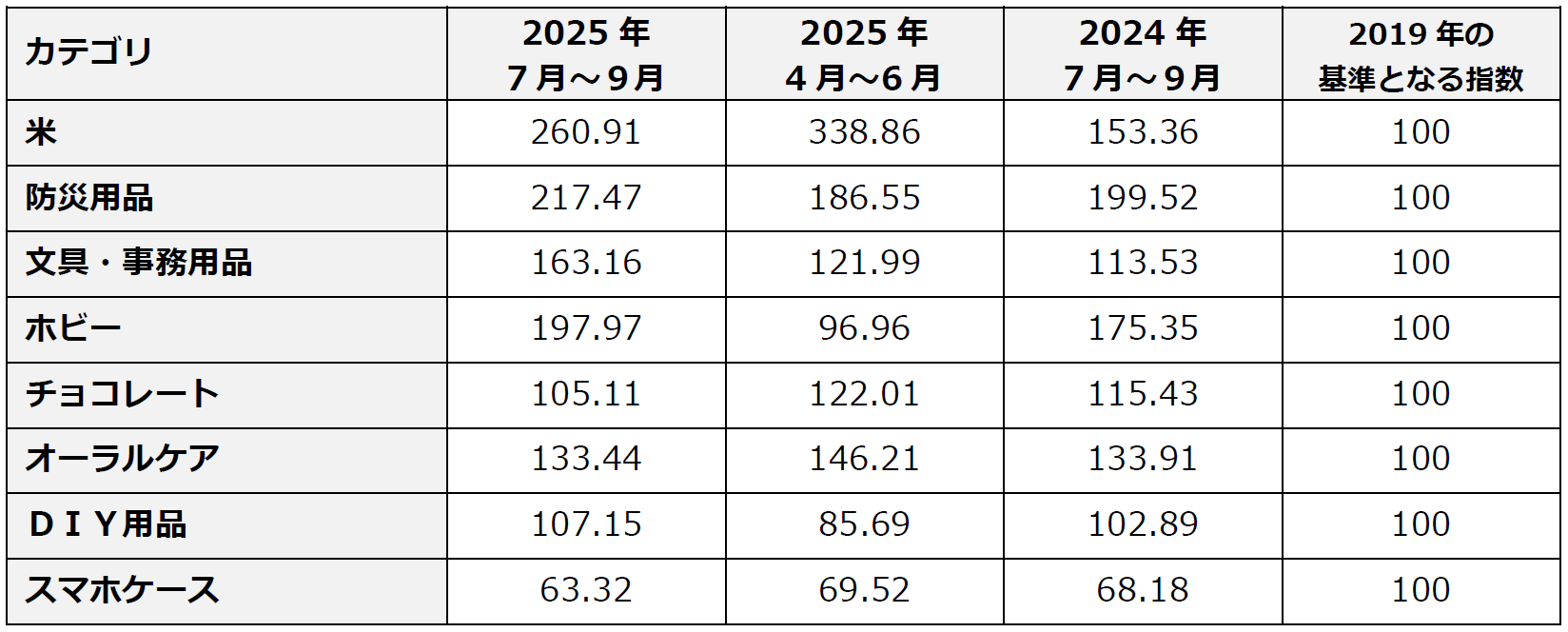 ホビー同様、前期は下落しましたが、今期は力強く回復しました。「文具・事務用品」は夏休み明けの新学期や企業の年度後半に向けた需要が考えられます。「DIY用品」も力強く回復しました。このカテゴリは、過ごしやすい気候となる秋に需要が高まる傾向があります。リフォームや庭の手入れといったDIY活動が活発になるため、それに伴い軍手や住まいの修繕用品などの価格が上昇したと考えられます。