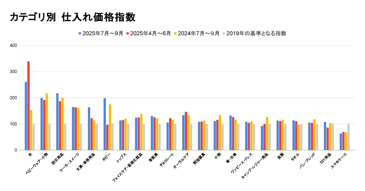 本レポートは、卸・仕入れサイト「スーパーデリバリー」における商品の仕入れ単価(1個あたり)の動向を、2019年を基準(=100)とした価格指数として分析したものです。2025年7月~9月のデータに基づき、主要ジャンルごとの価格変動を前期(2025年4月~6月)と比較しながら解説します。