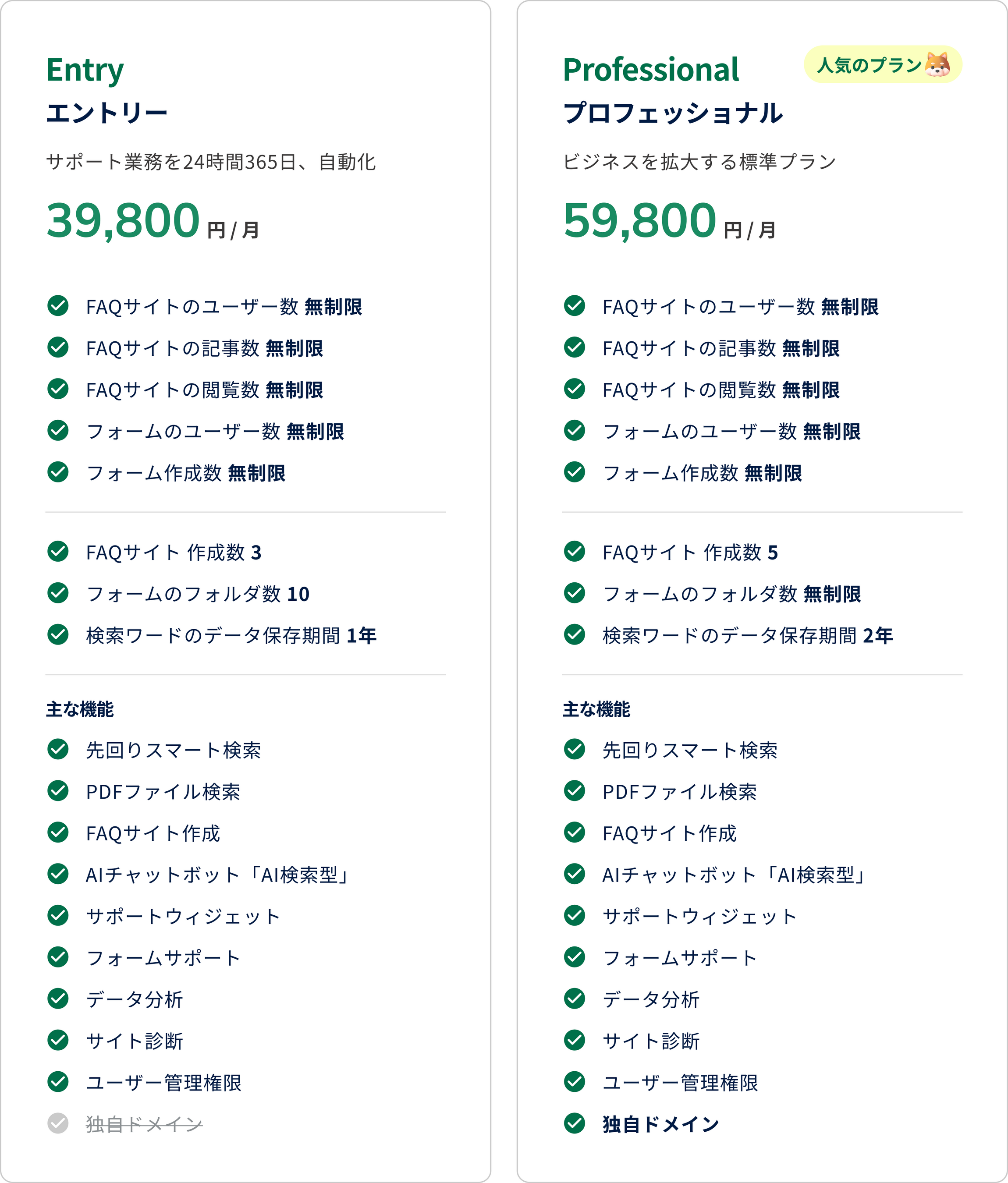 導入規模や運用方針に合わせて選べる「エントリー」と「プロフェッショナル」の2種類を用意しています。両プランともFAQの記事数・閲覧数・ユーザー数・フォーム作成数に制限はなく、すべて無制限で利用可能です。コンテンツ作成などにおける従量課金の心配がなく、長期的な運用を前提とした導入が可能です。