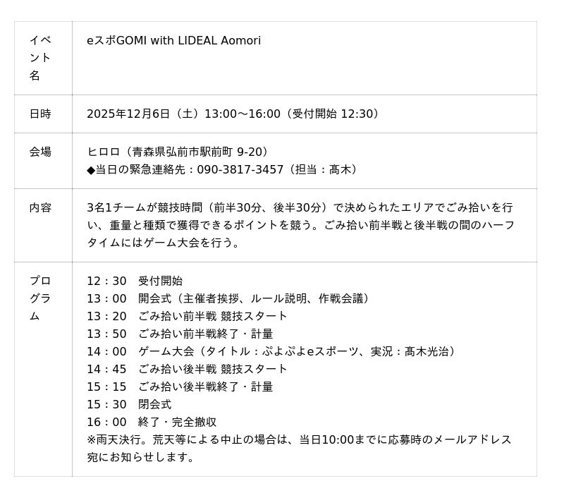 株式会社Life Reversal Gaming.(所在地:東京都文京区、代表取締役:高木 光治)は、青森県への地域貢献を目指し開催される「eスポGOMI with LIDEAL Aomori」の運営に、eスポGOMI開催委員会の一員として参画いたします。なお、本イベントは、青森県全域を本拠地とするサッカークラブ「LIDEAL Aomori」(代表理事:多々良 敦斗)が開催するものです。