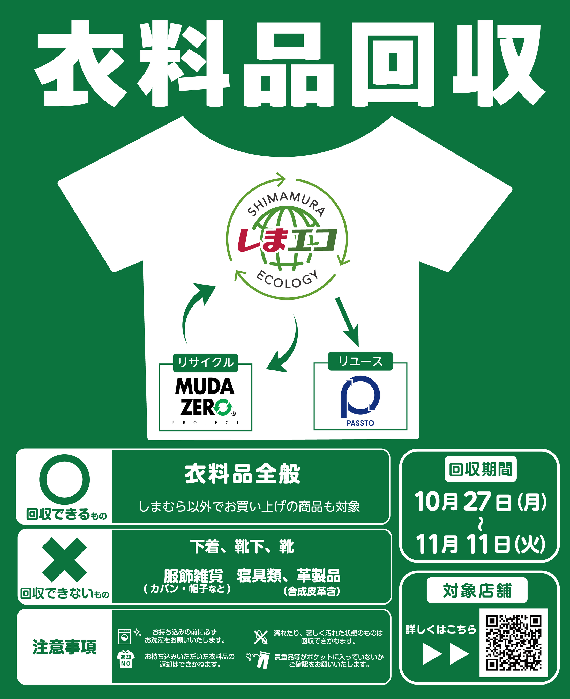 循環型社会に向けた不要品の回収・選別・再流通のインフラを構築する株式会社ECOMMIT(本社: 鹿児島県薩摩川内市、代表取締役CEO:川野 輝之、以下「ECOMMIT」)と、株式会社しまむら(本社所在地:埼玉県さいたま市、代表取締役:高橋 維一郎)は、10月27日(月)から11月11日(火)までの期間、しまむらグループ全国900店舗にて衣料品回収を実施します。