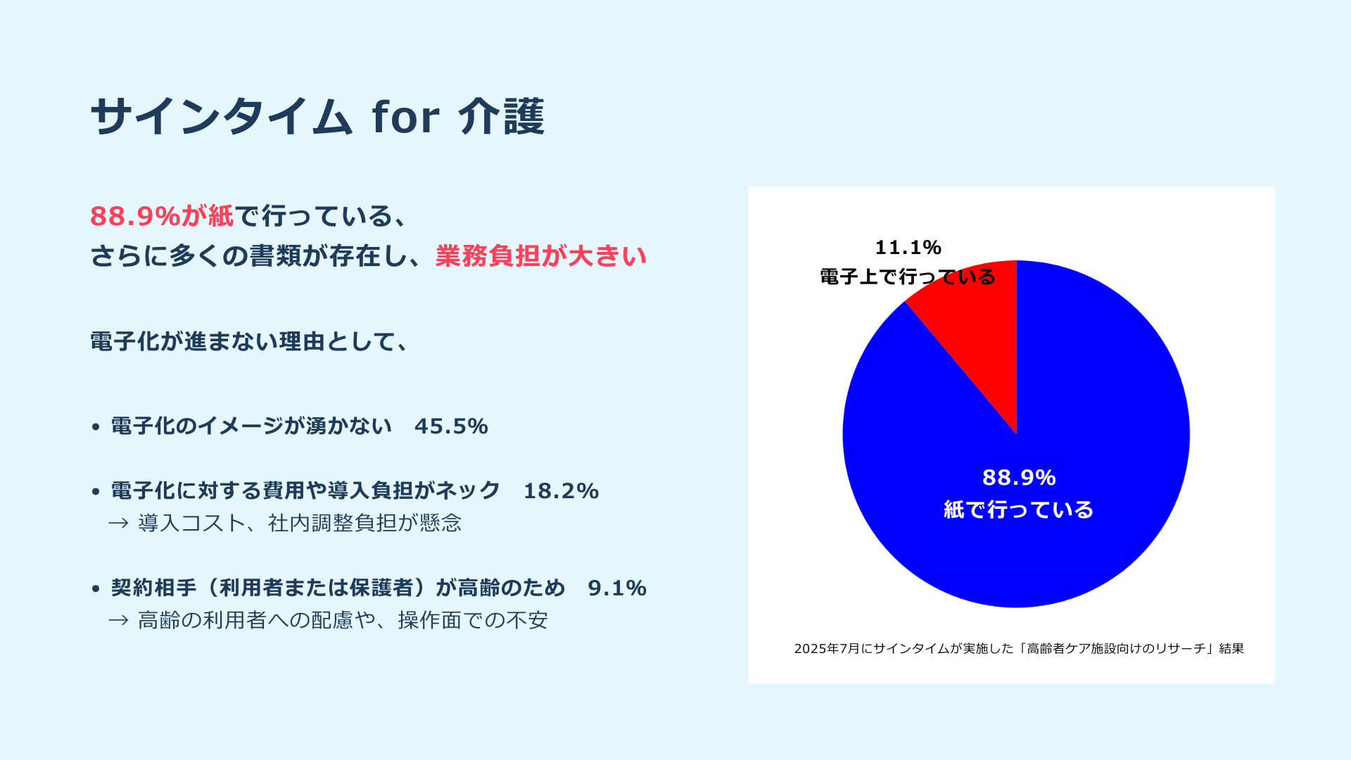 サインタイムの調査(2025年7月実施)によると、介護施設の約9割が契約業務を紙で運用していることがわかりました。