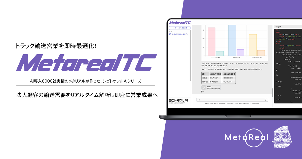 メタリアル・グループの株式会社ロゼッタ(代表取締役:五石 順一)は、法人貨物輸送需要予測レポートAIエージェント「Metarealトラックロジスティクス」(以下、Metareal TC)を2025年11月11日(火)に新開発・提供開始しました。