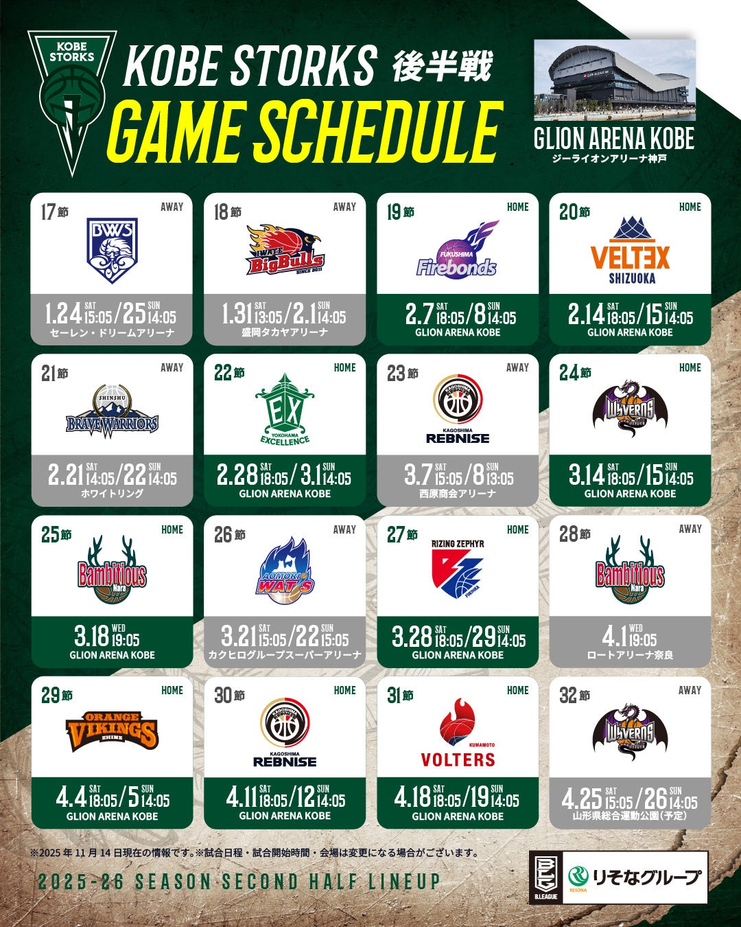 ■りそなグループ Bリーグ 2025-26シーズン 神戸ストークス 試合日程