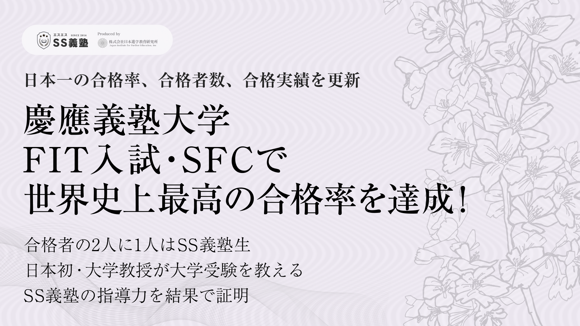 業界最大手予備校グループの傘下であり、総合型(旧AO入試)/推薦入試マーケットで国内トップシェアを誇る専門予備校「SS義塾」を運営する株式会社日本進学教育研究所(本社:東京都港区北青山/代表取締役HDグループCEO 苗田岳史)は、2025年度 慶應義塾大学総合型選抜において、法学部FIT入試79名、SFC122名の合格を達成しました。いずれも合格率・占有率・合格者数のすべてで全国第1位となり、創立以来の最高実績を樹立しました。