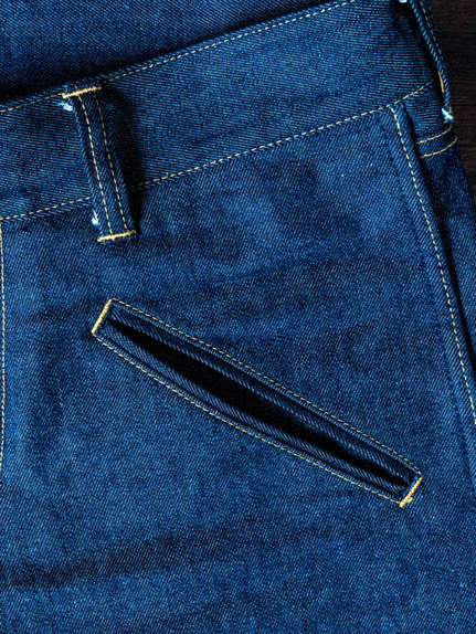 デニムには珍しい袋ポケットと膝裏は立体裁断