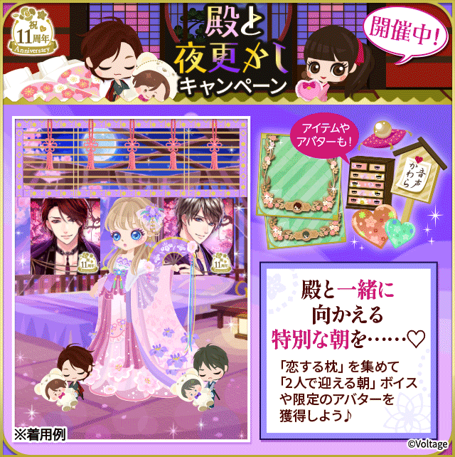 11周年を記念したキャンペーン「殿と夜更かしキャンペーン」を開催いたします。物語を読み進めると、イベント用アイテム「恋する枕」が手に入ります。