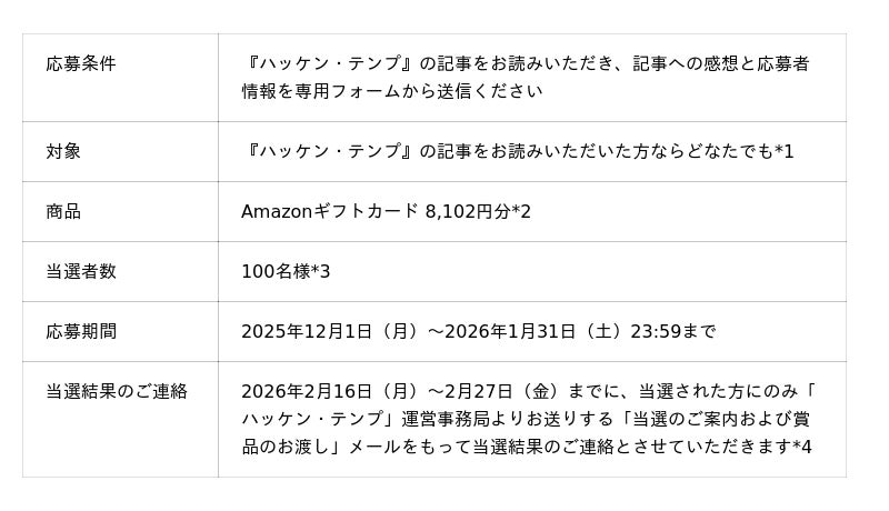 本キャンペーンでは、『ハッケン・テンプ』の記事を読んで感想を送っていただいた方の中から抽選で100名様に、“8,102(ハッケン・テンプ)円”のAmazonギフトカードをプレゼントします。どなたでもご応募いただけますので、ぜひご応募ください。