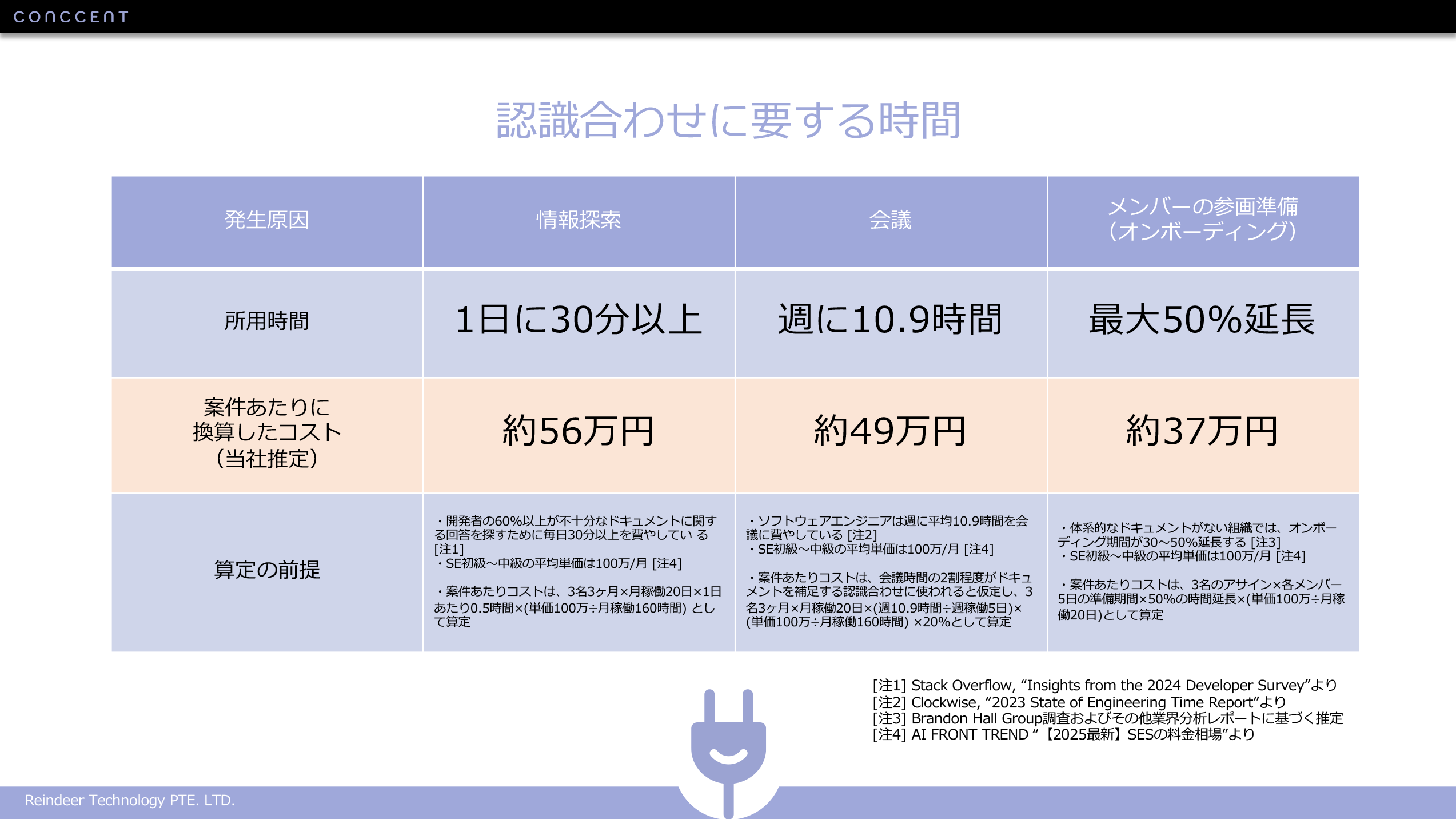 さらに Clockwise 社のレポートでは、ソフトウェアエンジニアは週に平均10.9時間を会議に費やしているとされ[注2]、体系的なドキュメントがない組織では、オンボーディング期間が30~50%延長すると推定されています[注3]。