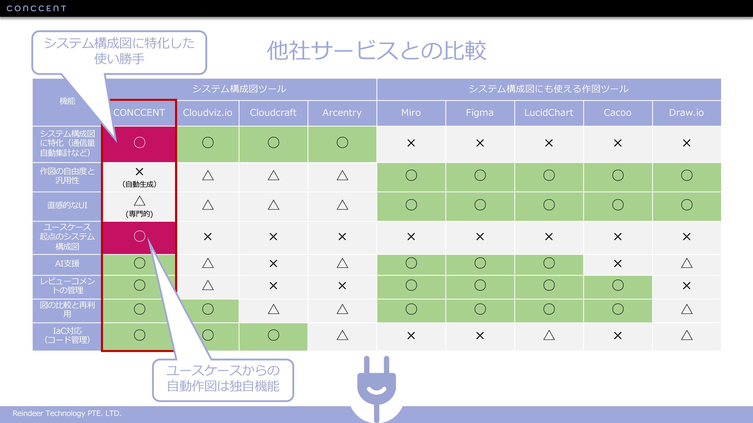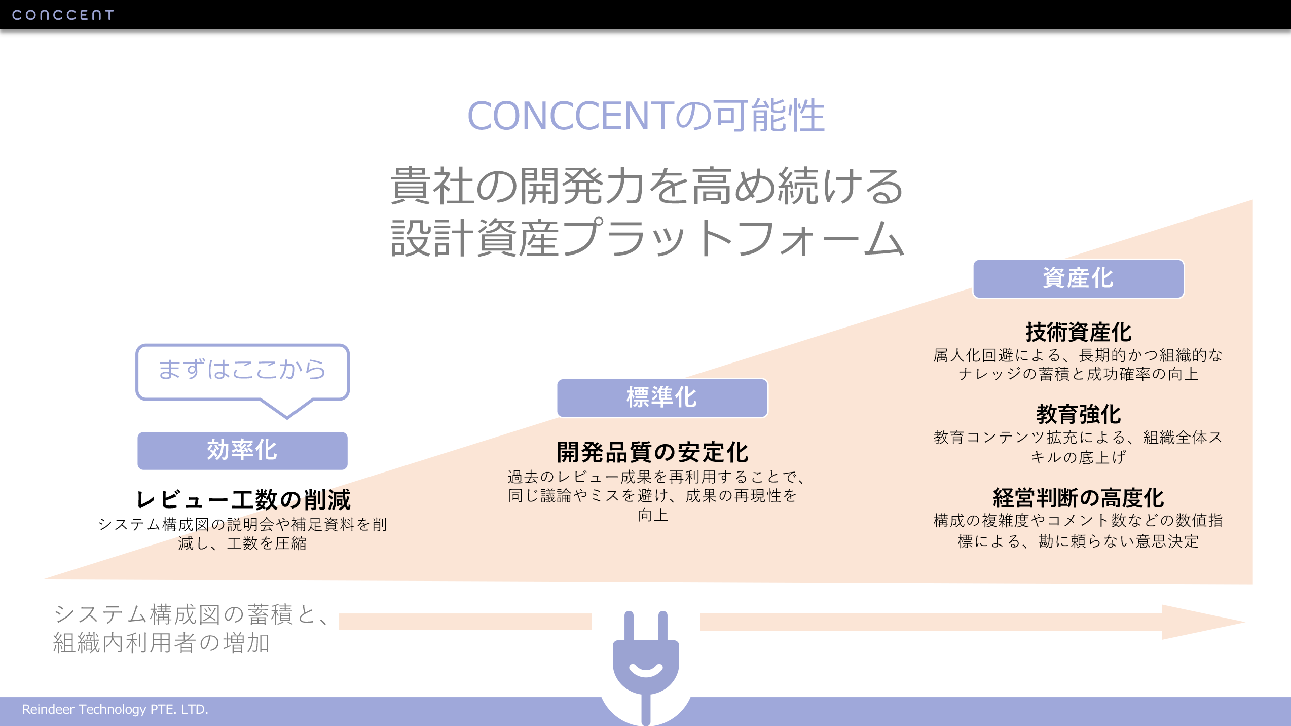 レインディア テクノロジー(英文:Reindeer Technology PTE. LTD.、本社:シンガポール、CEO:原 伸太郎、CMO:池田 祐樹、以下 レインディア)は、システム開発におけるレビュー工数の増大、認識齟齬、ドキュメント不足による手戻りを大幅に削減する、ユースケース起点のシステム構成図ツール「CONCCENT(コンセント)」を正式リリースしました。