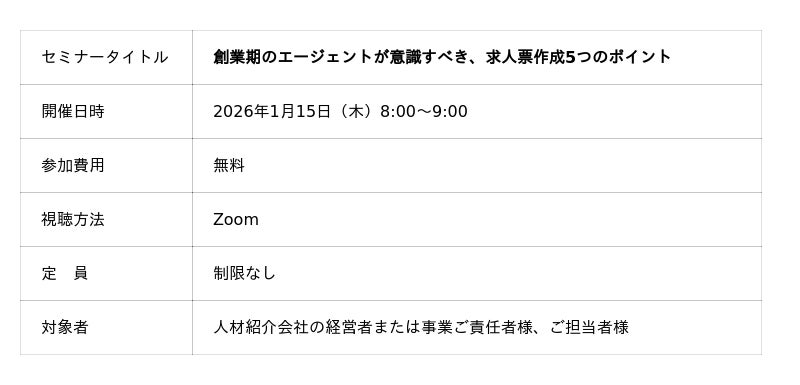 ▼▼セミナー概要▼▼人材紹介事業においては、“魅力的な求人票作成”は必須です。特に、創業期フェーズで広告に頼らず最大限に集客を行う必要がある企業にとってはより重要であるといえるでしょう。