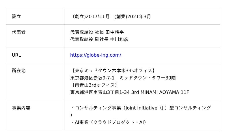 Email: info@globe-ing.com企業プレスリリース詳細へ : https://prtimes.jp/main/html/rd/p/000000046.000093540.htmlPR TIMESトップへ : https://prtimes.jp