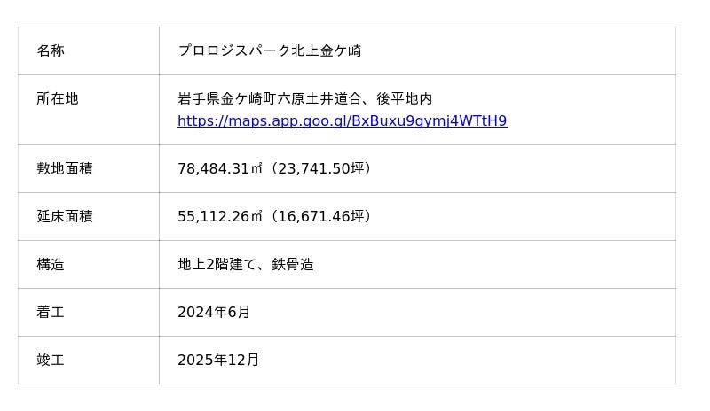 「プロロジスパーク北上金ケ崎」は、約78,500平方メートル の敷地に地上2階建て、延床面積約55,000平方メートル のマルチテナント型物流施設として開発されました。