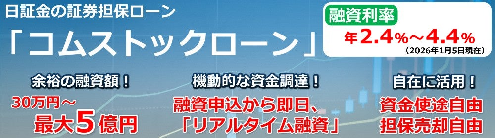 日本証券金融株式会社(本社:東京都中央区、代表執行役社長:櫛田 誠希、以下「日証金」)は、個人が保有する株式を担保に、融資申込から最短即日で資金調達ができる「コムストックローン」において、新規ご契約のお客様を対象にご契約日より最大3か月間、基準金利から▲2.0%の特別金利で利用できるキャンペーンを実施中です。