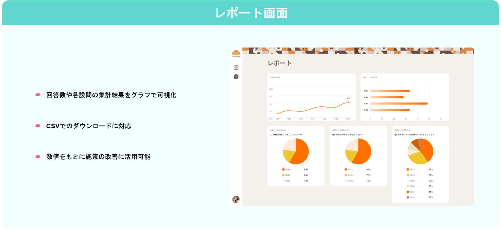 「クロワッサン」は、ノーコードでオンラインガチャ・診断・アンケートを作成できるマーケティングツールです。企画~公開~運用までをスピーディに回し、キャンペーンやプロモーション施策の成果最大化を支援します。