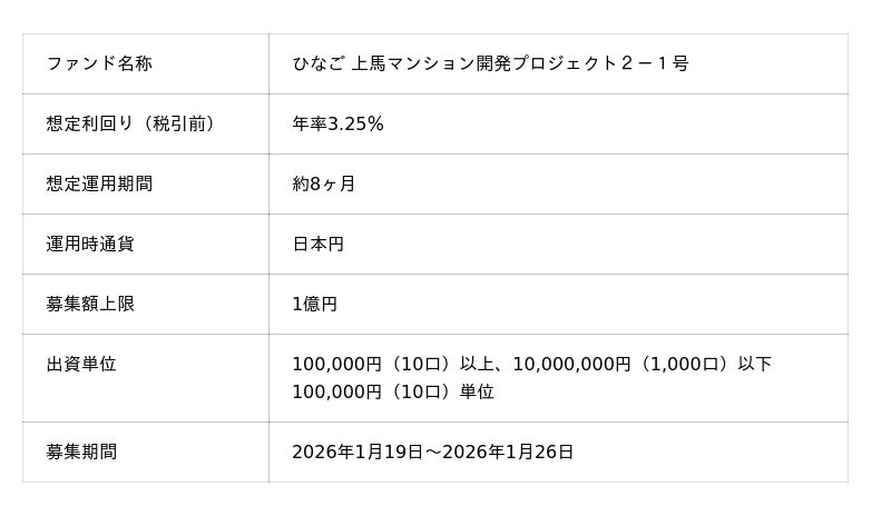 「未来をわかちあう投資」を提供する「Funvest(ファンベスト)」(以下、Funvest)は、「ひなご 上馬マンション開発プロジェクト2-1号」(以下、本ファンド)の募集を1/19より開始しますので、お知らせいたします。