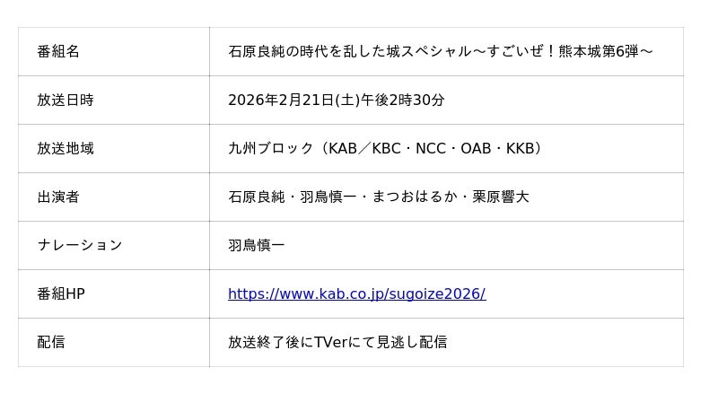 熊本朝日放送株式会社(本社:熊本県熊本市西区、代表取締役社長:⽵内圭介)は、2026年2月21日(土)午後2時30分から特別番組『石原良純の時代を乱した城スペシャル~すごいぜ!熊本城第6弾~』を放送します。