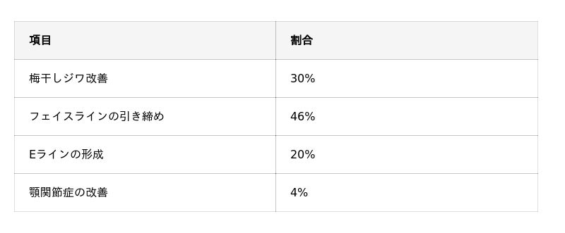 そのほか、「梅干しジワ改善」(30%)や「Eラインの形成」(20%)と回答した人も一定数おり、施術目的が複数に分かれていることが確認できます。