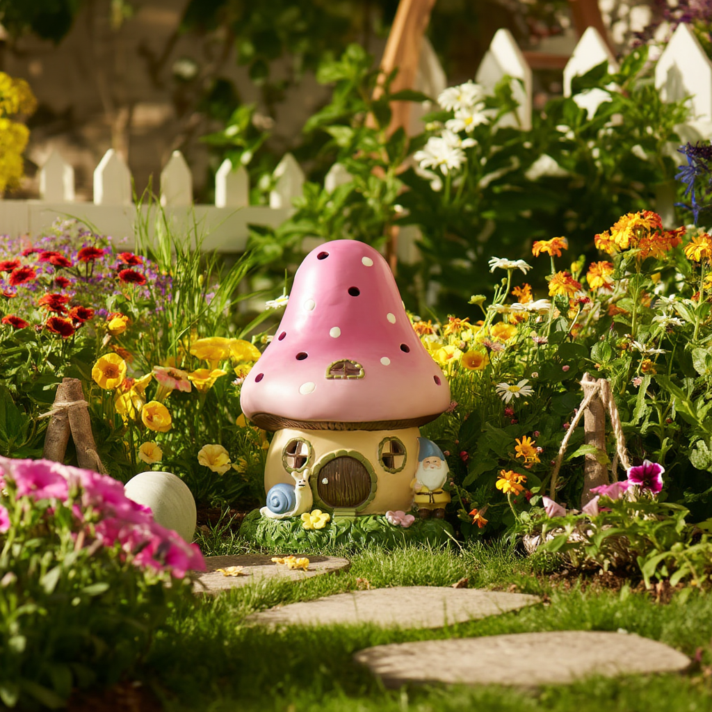 カタツムリと小人が住んでいる小さなお家。後ろにソーラーがついていて、暗くなると自然に光る仕組み。お庭が華やかになります。お部屋や玄関で使用してもOK