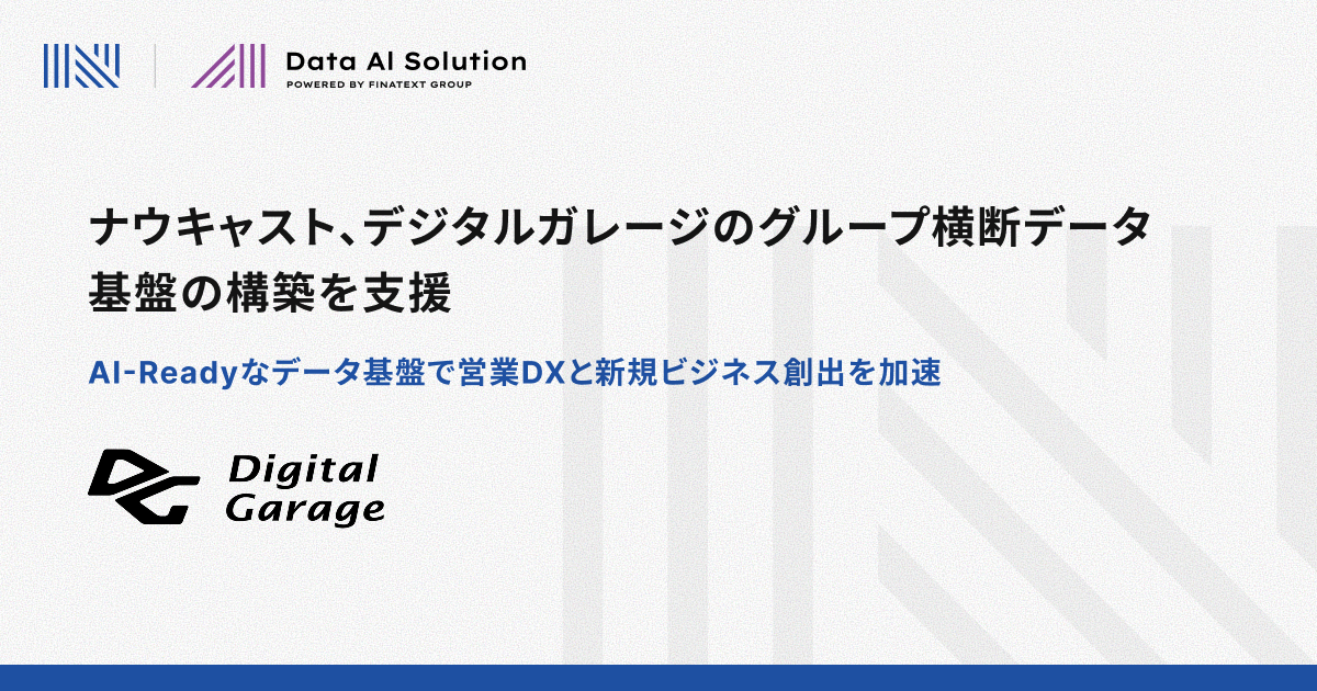 次世代金融インフラの提供を通して組込型金融を実現するFinatextグループの株式会社ナウキャスト(本社:東京都千代田区、代表取締役CEO:辻中 仁士、以下「ナウキャスト」)は、株式会社デジタルガレージ(以下「デジタルガレージ」)が推進するグループ横断データ基盤プロジェクトにおいて、Snowflakeを活用したAI-Readyなデータ基盤の構築を支援しました。