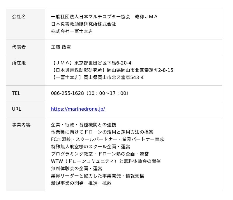 JMA(正式名称:一般社団法人日本マルチコプター協会 本社:東京都世田谷区、代表理事:工藤 政宣)・日本災害救助艇研究所株式会社(本社:岡山県岡山市北区、代表取締役:工藤 政宣)・株式会社一冨士本店(本社:岡山県岡山市北区、代表取締役:工藤 政宣)(以下、マリンドローン共同開発チーム)は、既に開発を発表している水上ドローン「マリンドローン」について、2025年度に実施した各種実証試験の結果をご報告いたします。