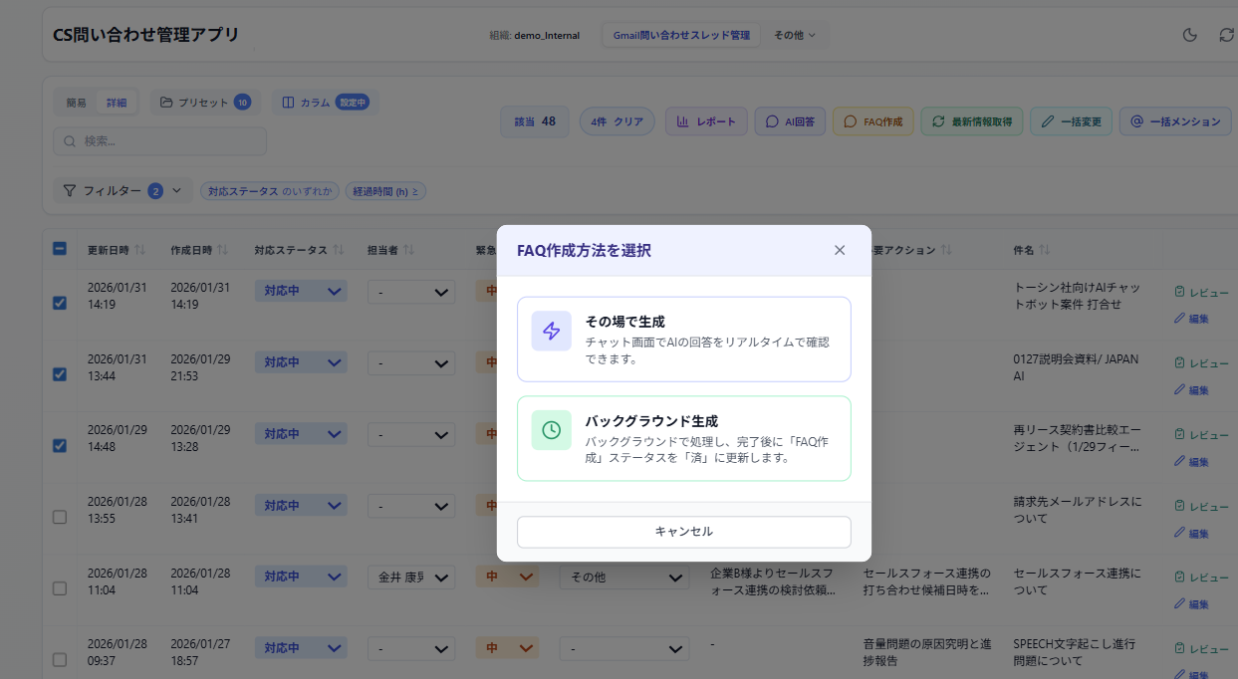 解決済みの問い合わせから、よくある質問と回答のペアを自動的に抽出し、FAQ記事として保存します。対応を重ねるほど社内のナレッジが蓄積され、次回以降の問い合わせ対応がさらに効率化されます。作成されたFAQは社内で共有され、新人教育や対応品質の標準化にも活用できます。