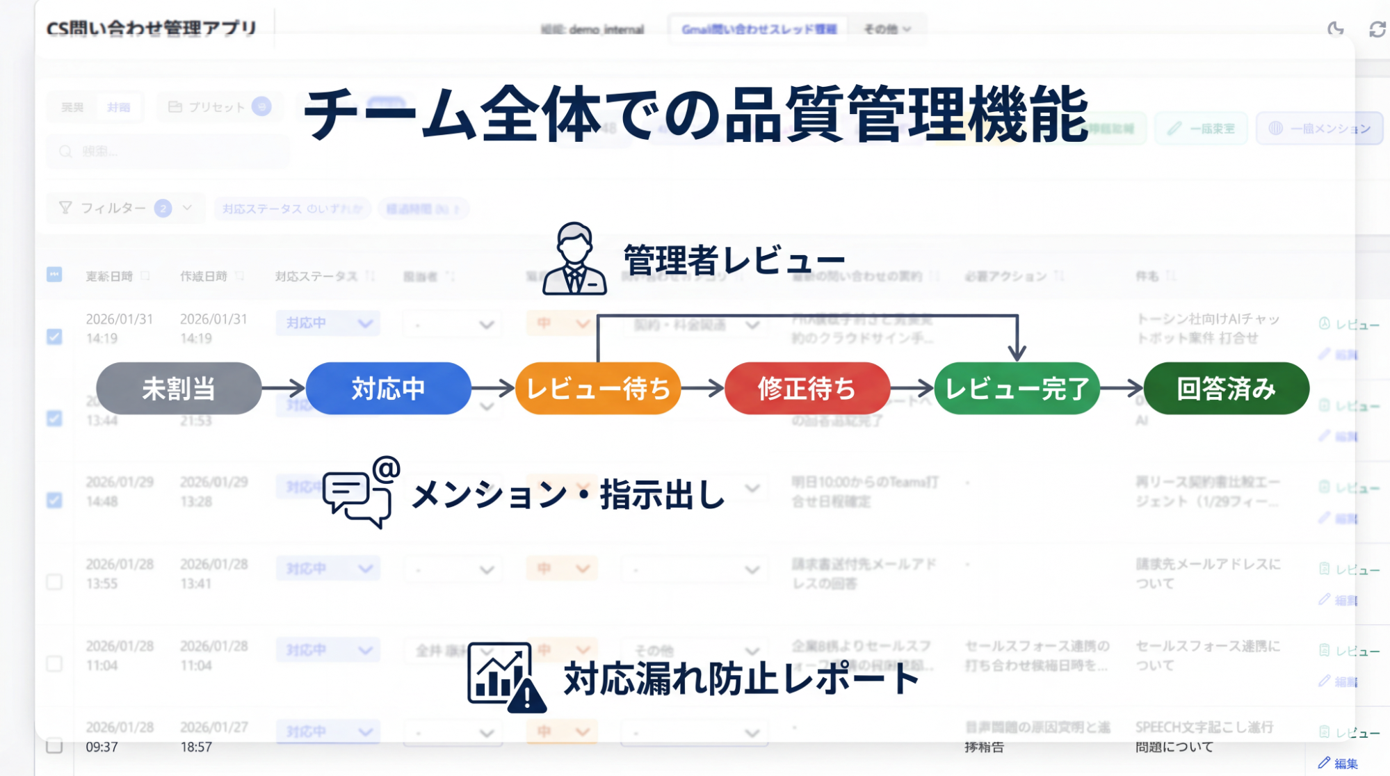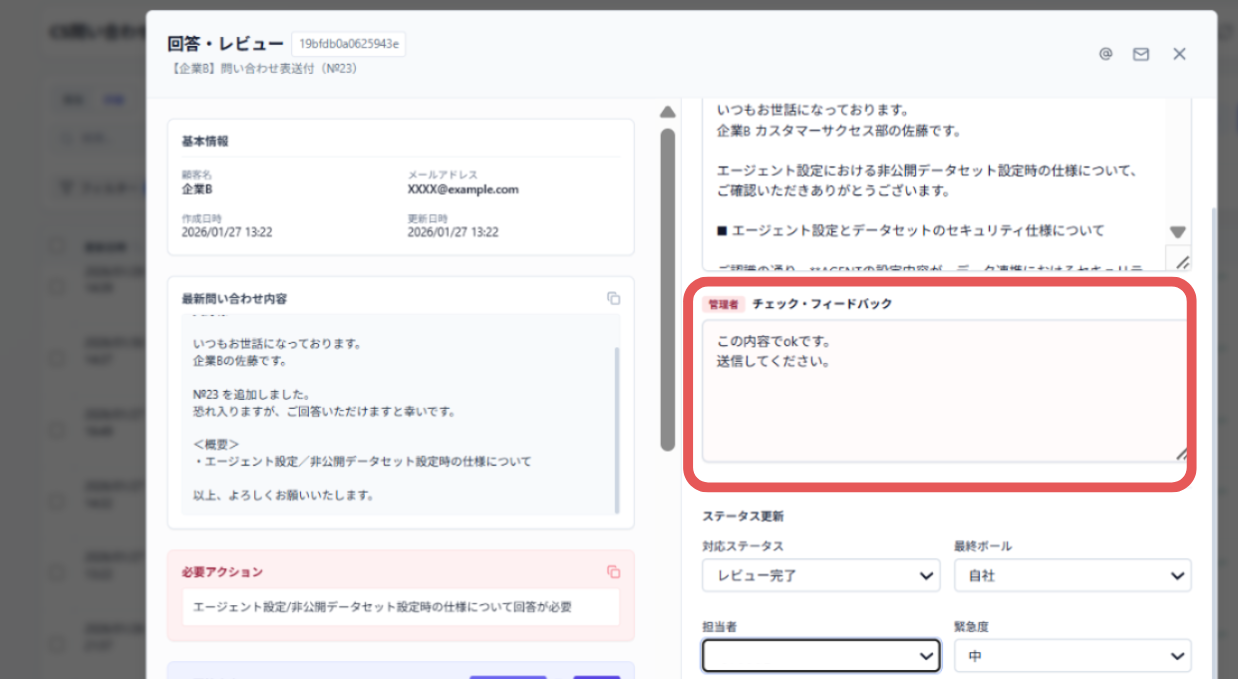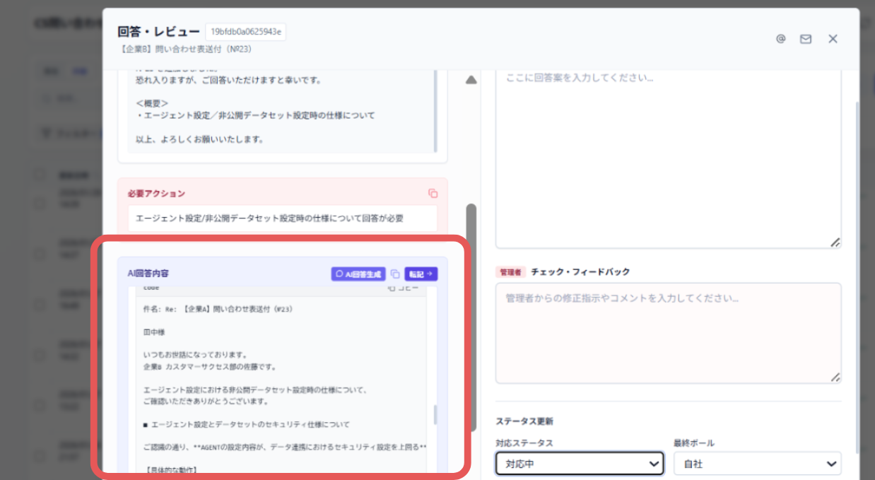 また、管理者による回答内容の確認機能を備えています。未割当、対応中、レビュー待ち、修正待ち、レビュー完了、回答済みといった詳細な状態管理により、対応の進捗を可視化します。メンション機能により、担当者への確認依頼や修正指示を円滑に行えます。