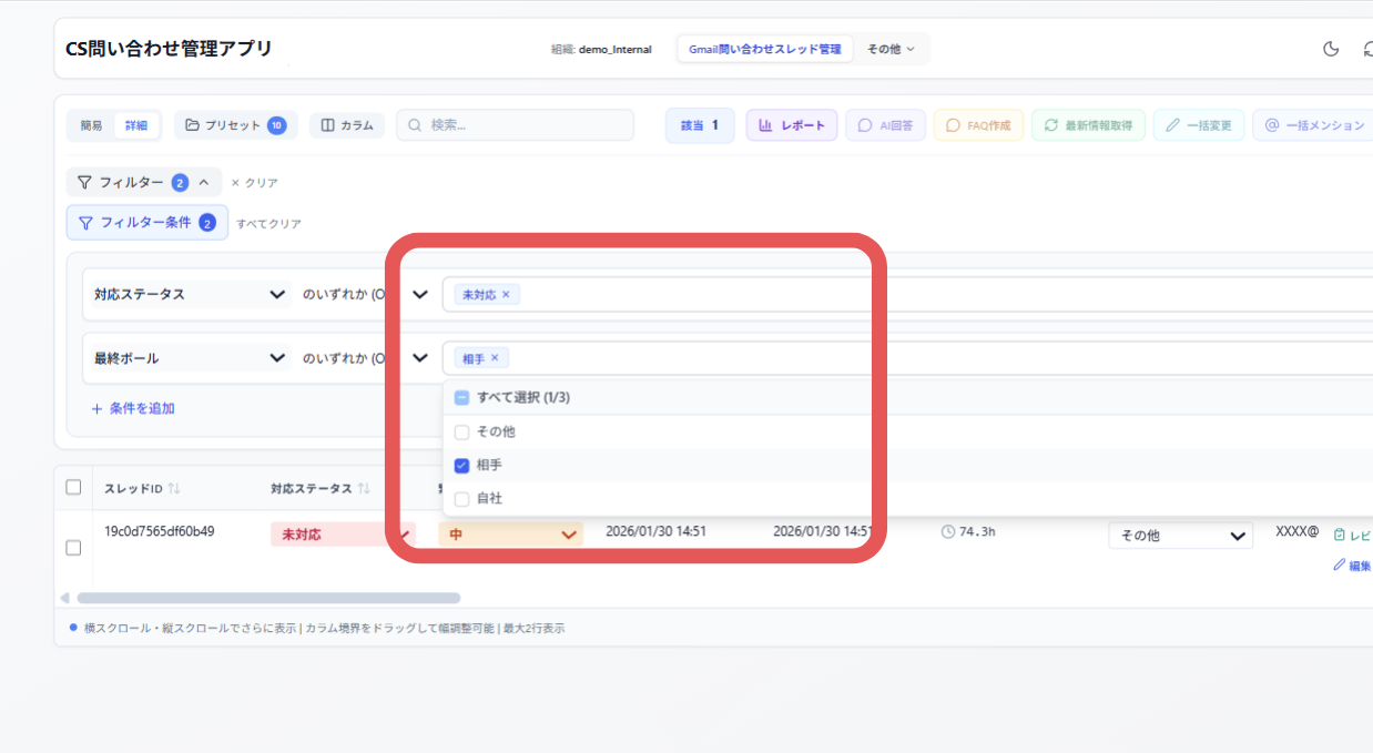 フィルタリングによってダッシュボードの情報が絞られ、問い合わせごとの対応状況がわかる