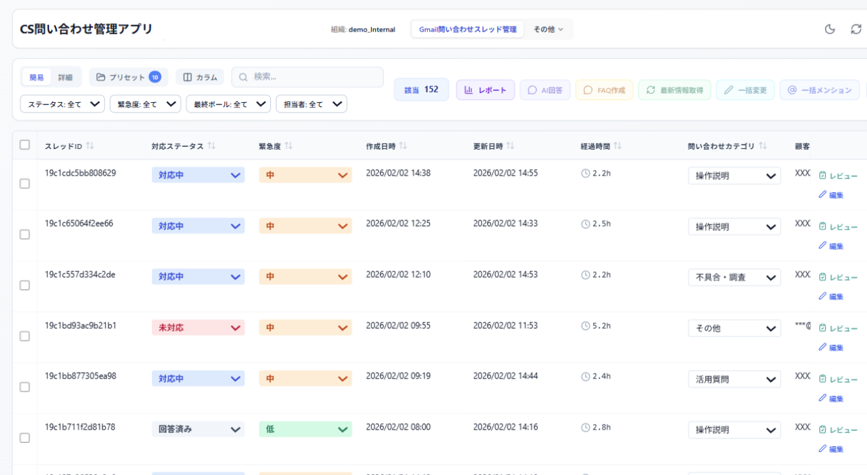 電子メールで届いた問い合わせは、自動的にアプリに取り込まれます。システムが問い合わせ内容を解析し、必要アクション、要約、緊急度を自動で判定します。管理者は一覧画面で未対応の問い合わせを確認し、適切な担当者に割り振ります。