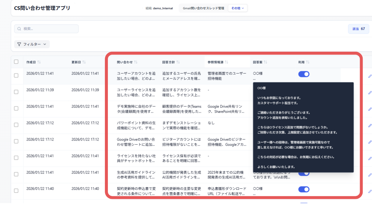 さらに、対応を重ねるほど組織の知識が蓄積され、経験の浅い担当者でも過去の事例を参照しながら適切な回答を作成できます。