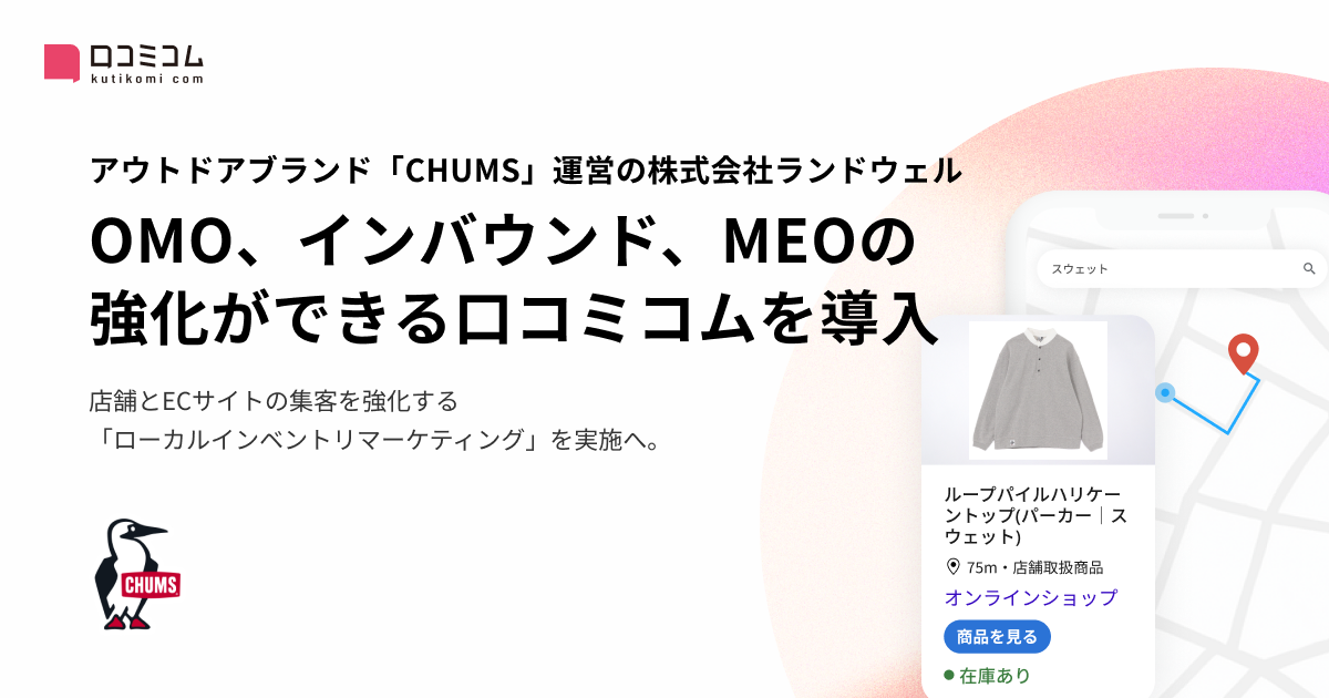 株式会社mov(代表取締役:渡邊 誠、本社:東京都渋谷区)が提供する店舗向け集客一元化プラットフォーム「口コミコム」が、アウトドアブランド「CHUMS」等を運営する株式会社ランドウェル(代表取締役:土屋 芳隆、本社:東京都港区)において、OMO強化および実店舗・自社ECサイトへの集客強化を目的としたローカルインベントリマーケティング施策として採用されたことをお知らせいたします。