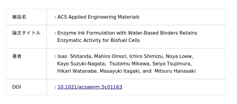本技術は、酵素バイオ燃料電池にとどまらず、乳酸、グルコース、その他の生体成分を対象としたバイオセンサや、印刷技術を用いた低コスト・量産型の計測デバイスへも応用可能です。「印刷できる酵素インク」という基盤技術を確立したことで、将来的には電池交換のいらないウェアラブルセンサや、環境・医療・スポーツ分野での新しい計測デバイスの実現につながることが期待されます。