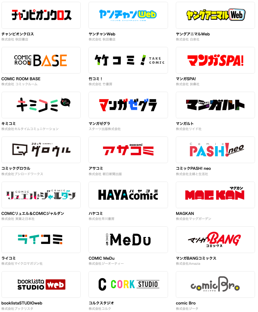 「チャンピオンクロス」「ヤンチャンWeb」(株式会社 秋田書店) / 「ヤングアニマルWeb」(株式会社 白泉社) / 「マンガゼグラ」(スターツ出版株式会社) / 「マンガルト -Mangalt-」(株式会社リイド社) / 「ハヤコミ」(株式会社 早川書房) / 「COMIC MeDu」(株式会社 ジーオーティー) / 「コミックPASH! neo」(株式会社 主婦と生活社) / 「コミックグロウル」(株式会社ブシロードワークス) / 「アサコミ」(株式会社 朝日新聞出版) / 「マンガSPA!」(株式会社 扶桑社) / 「COMICリュエル&COMICジャルダン」(株式会社 実業之日本社)/ 「竹コミ!」(株式会社 竹書房) / 「ライコミ」(株式会社 マイクロマガジン社) / 「キミコミ」(株式会社 キルタイムコミュニケーション) / 「MAGKAN」(株式会社 マッグガーデン) / 「マンガBANGコミックス」(株式会社Amazia) / 「booklistaSTUDIOweb」(株式会社 ブックリスタ) / 「コルクスタジオ」(株式会社 コルク)