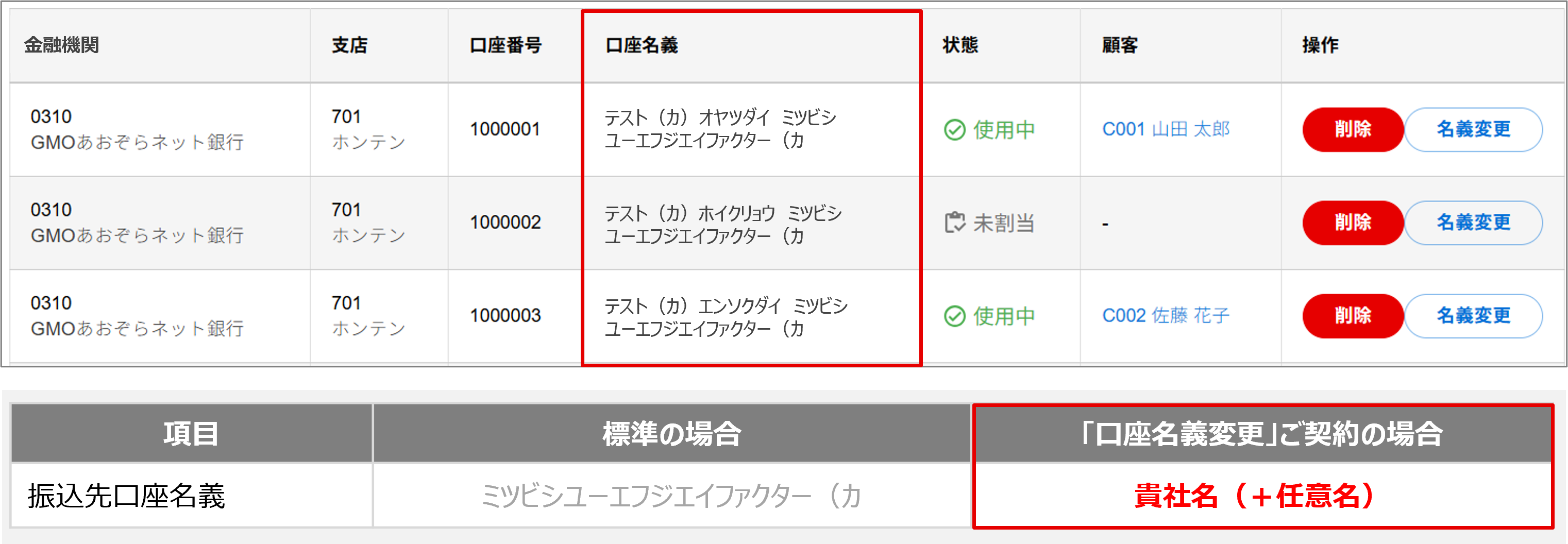 「口座名義変更」は、振込先口座名の先頭もしくは末尾に「ミツビシユーエフジエイファクター(カ」が付きます。