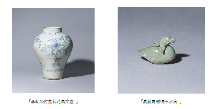 このうち「李朝染付盆栽花鳥文壷」は 18世紀の作品で、大きさがありながら破綻なく美しい形姿に、盆栽に小禽という珍しい意匠が施された傑作です。また、12世紀に作られた「高麗青磁鴨形水滴」は蓮茎を咥えた鴨を象った瀟洒な作品です。動植物の姿を模した象形青磁は、高麗独自の美感を高い技量で表した高麗青磁の達成の一つに数えられ、同意匠の水滴は韓国の国宝に指定されております。以上の2点をはじめとした高麗・李朝の陶磁器を中心に、華角張の箱など多彩な作品を取り揃えております。