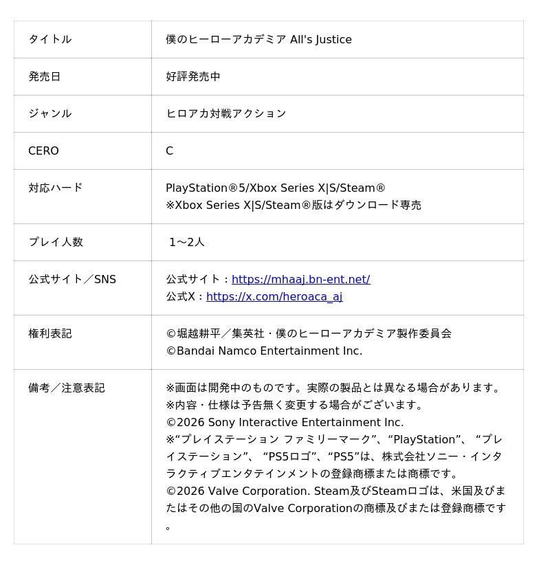 PlayStation(R)5/Xbox Series X|S/Steam(R)にて好評発売中の『僕のヒーローアカデミア』家庭用ゲーム最新作「僕のヒーローアカデミア All's Justice」につきまして、有料ダウンロードコンテンツ 第1弾のプレイブルキャラクター、「スターアンドストライプ」が本日(2月26日)配信開始されたことを