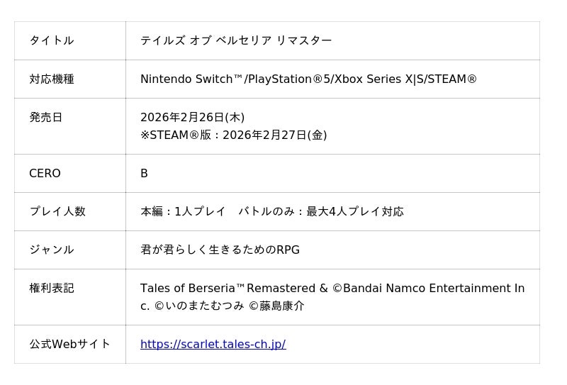 株式会社バンダイナムコエンターテインメントは、Nintendo Switch(TM)/PlayStation(R)5/Xbox Series X|Sにて「テイルズ オブ ベルセリア リマスター」を発売したことをお知らせいたします。STEAM(R)版は2月27日(金)に発売いたします。