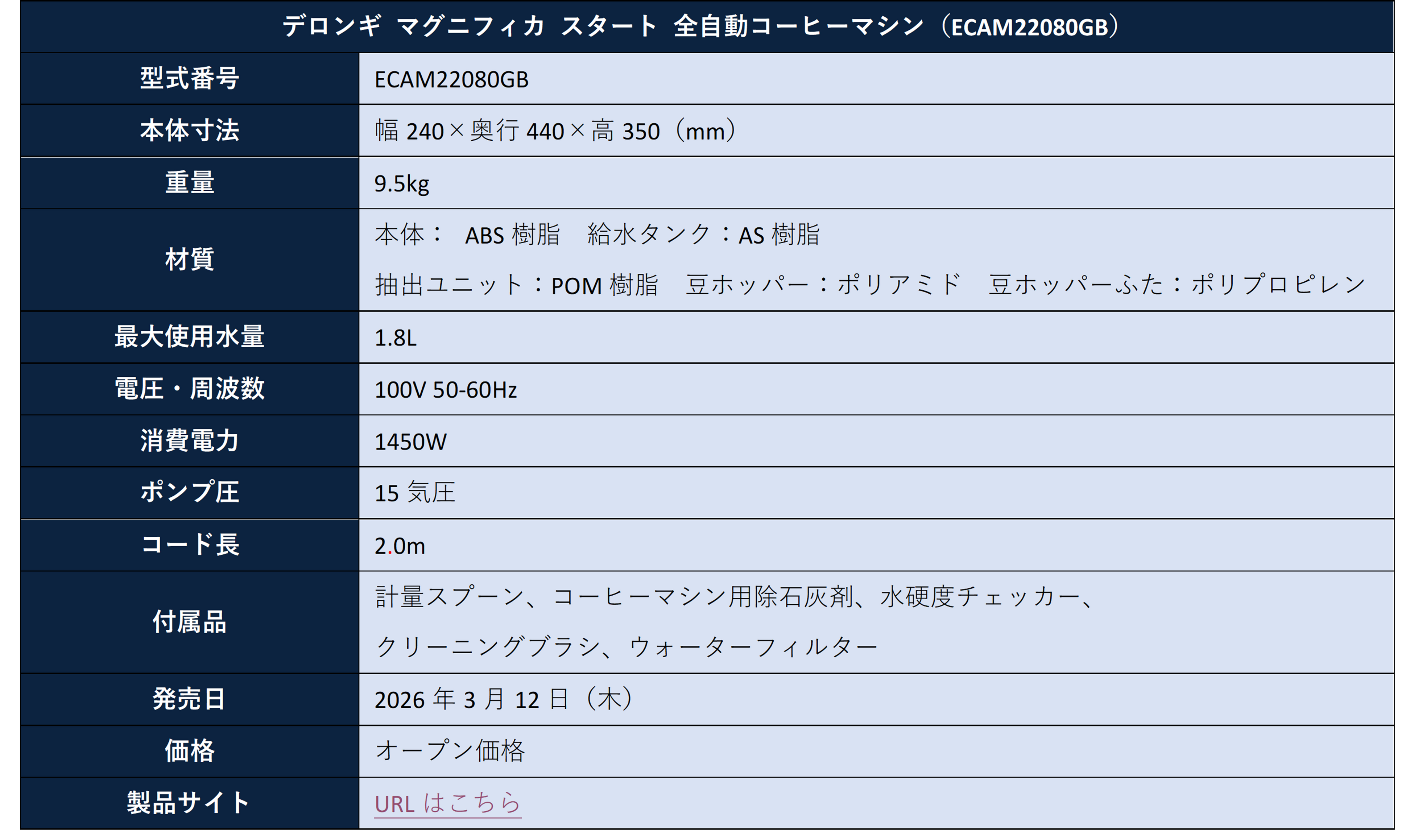 デロンギ・ジャパン株式会社(本社:東京都港区 代表取締役社長:甲斐ラース)は、人気のコーヒー、ミルクメニューをワンタッチで愉しめる全自動コーヒーマシンの新モデル『デロンギ マグニフィカ スタート 全自動コーヒーマシン(ECAM22080GB)、以下マグニフィカ スタート ミルクモデル』を、2026年3月12日(木)より発売いたします。