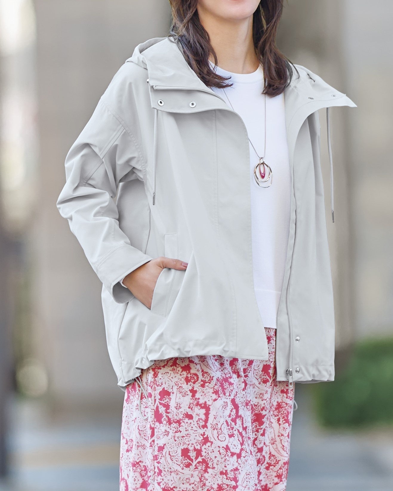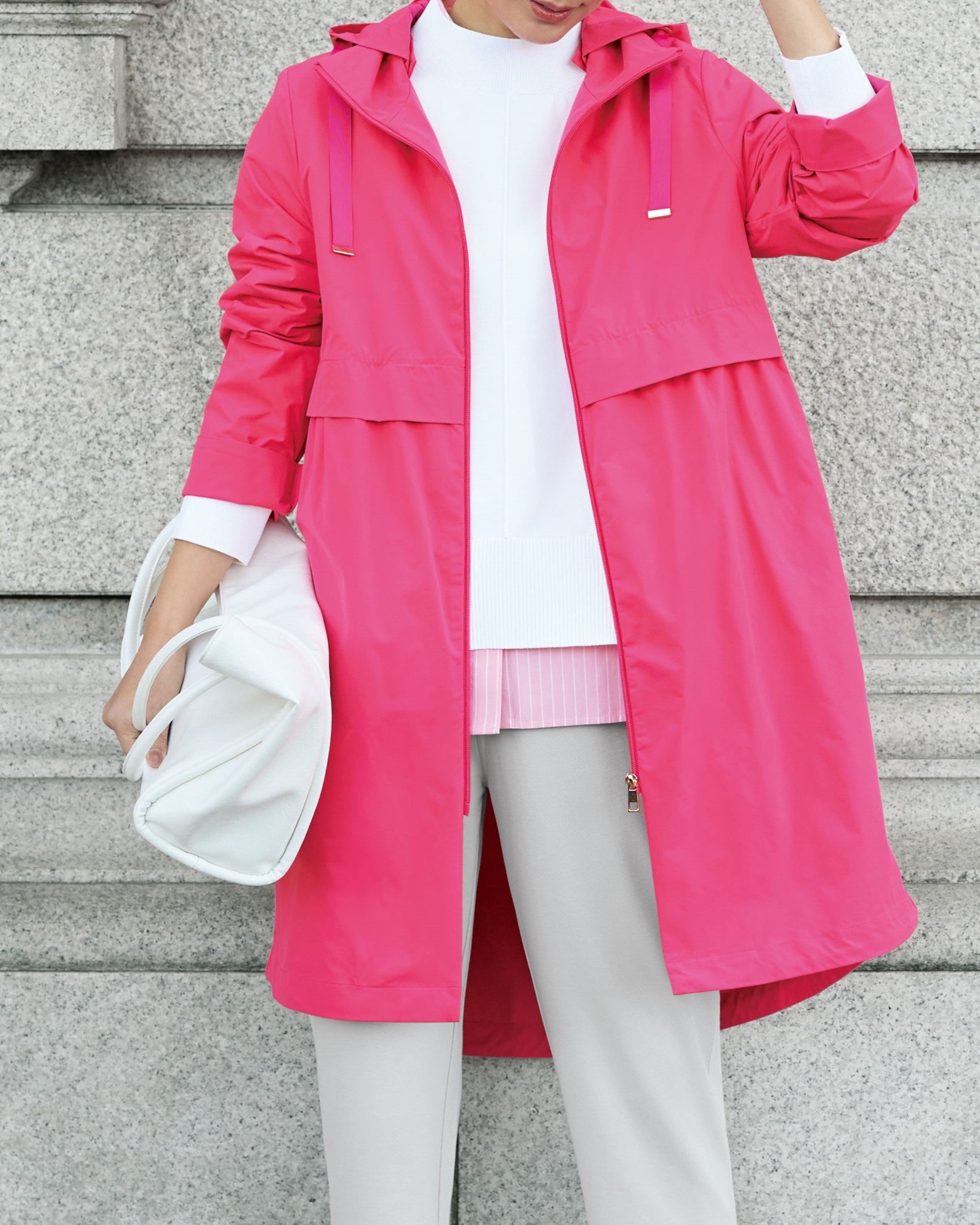 女性らしいAラインに、フードデザインを採用し、きれいめにもアクティブにも対応するアウターです。適度なハリ感と艶のある素材が、春の装いを品よく引き立てます。
