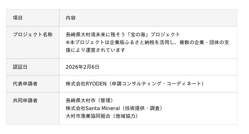 株式会社RYODENは、長崎県大村市が行っている大村湾SDGsプロジェクト事業に対し、企業版ふるさと納税を通じた支援を行うとともに、この度、長崎県大村湾未来に残そう「宝の海」プロジェクトにおける「Jブルークレジット※1(認証量:0.4t-CO2)」の認証手続きを「代表申請者」として主導し、大村市初となる同クレジットの発行が承認されました。