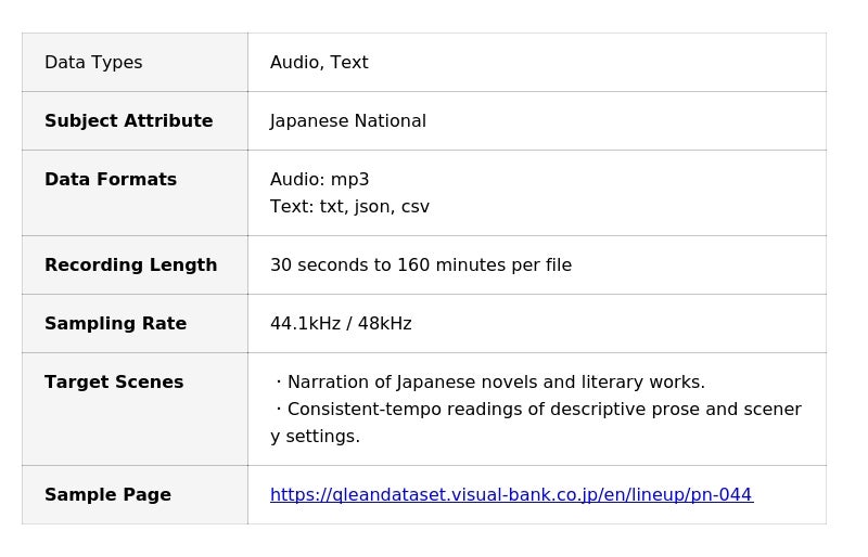 Visual Bank Inc. is pleased to announce the release of the "Japanese Single-Speaker Literary Reading Dataset," optimized for training high-quality Text-to-Speech (TTS) models, improving Automatic Speech Recognition (ASR) accuracy, and advancing Natural Language Processing (NLP) research.