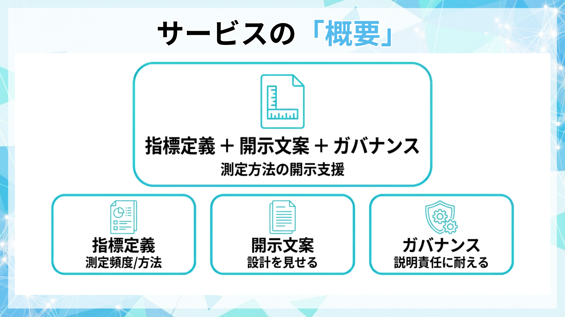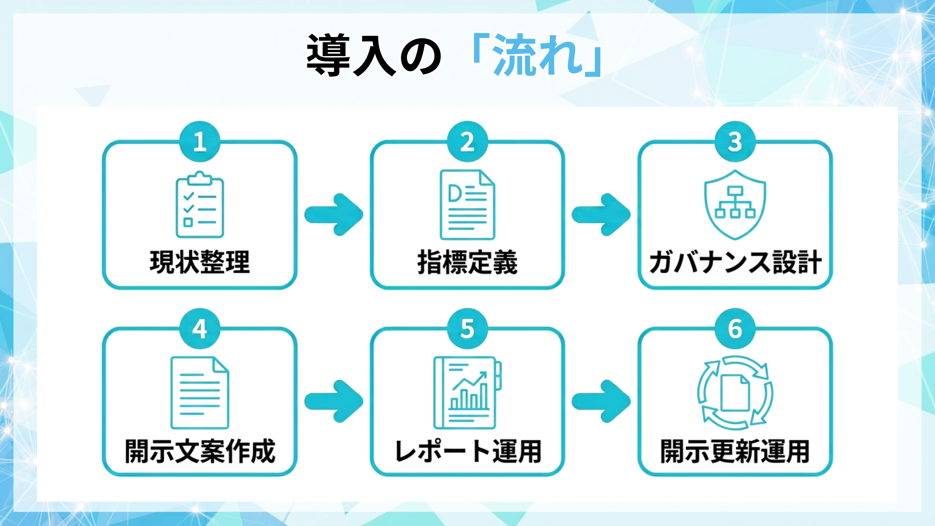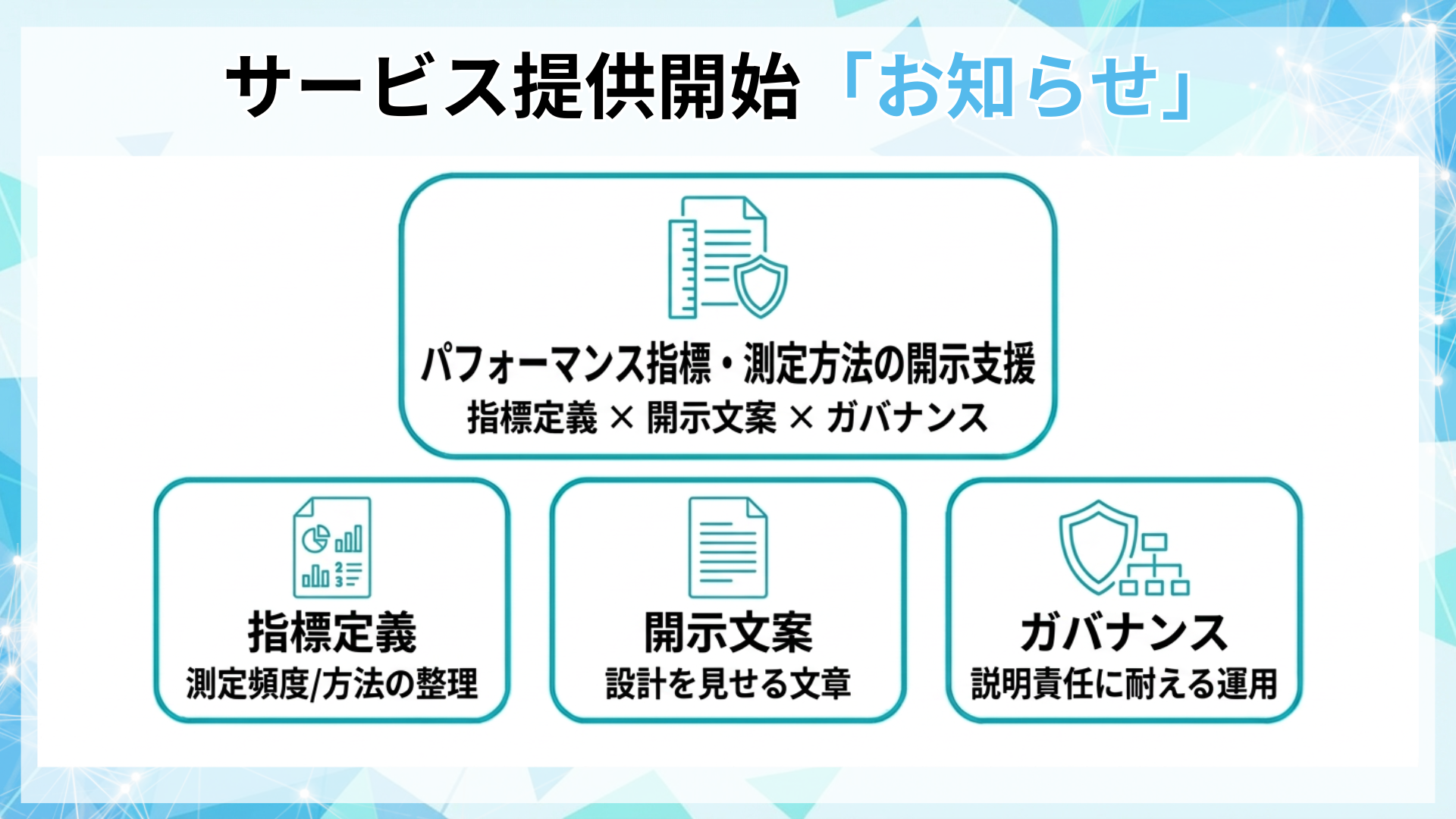 本支援は、指標の設計から開示、運用体制までを一体で整備します。