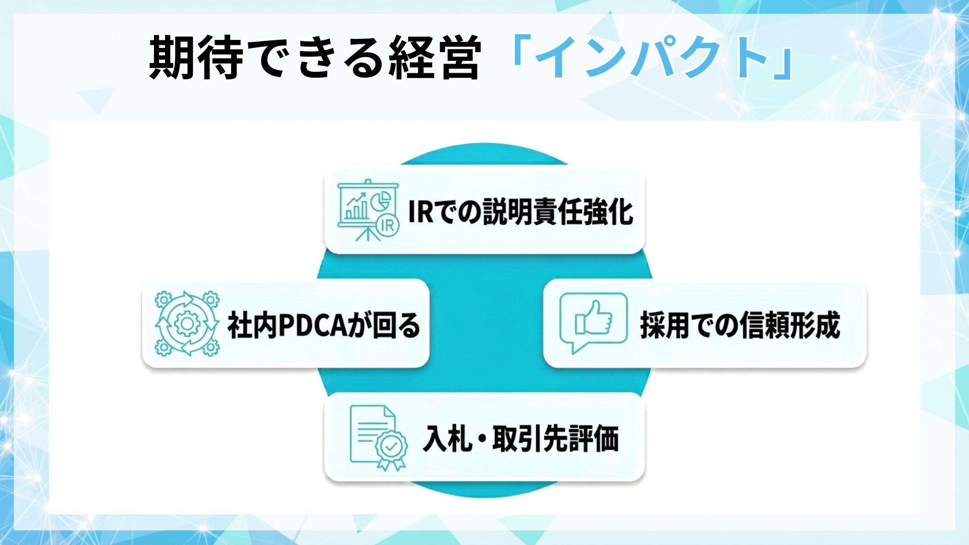 期待できる経営インパクト(IR・採用・入札等への波及)[画像5: https://prcdn.freetls.fastly.net/release_image/118106/83/118106-83-cd090fb0cec70c3d1072abee50cbf759-1920x1080.png?width=536&quality=85%2C75&format=jpeg&auto=webp&fit=bounds&bg-color=fff ]