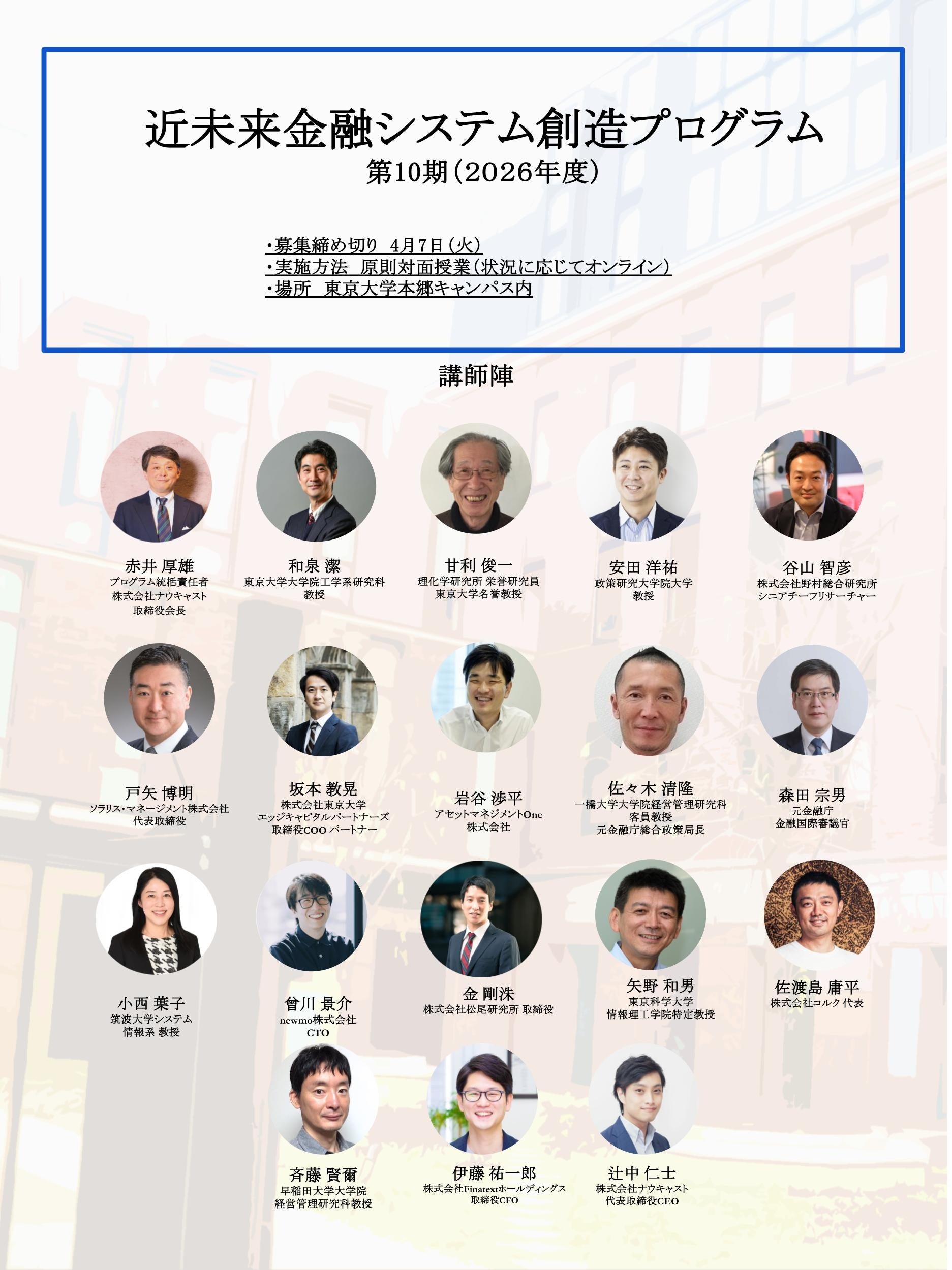 次世代金融インフラの提供を通して組込型金融を実現し、金融がもっと暮らしに寄り添う世の中をめざす株式会社Finatextホールディングス(本社:東京都千代田区、代表取締役社長CEO:林 良太、以下「Finatextホールディングス」)は、近未来の金融システムを創る中核人材の育成を目的として2017年から開講している「近未来金融システム創造プログラム」(プログラム統括責任者:赤井厚雄)を、2026年度も開講することをお知らせします。