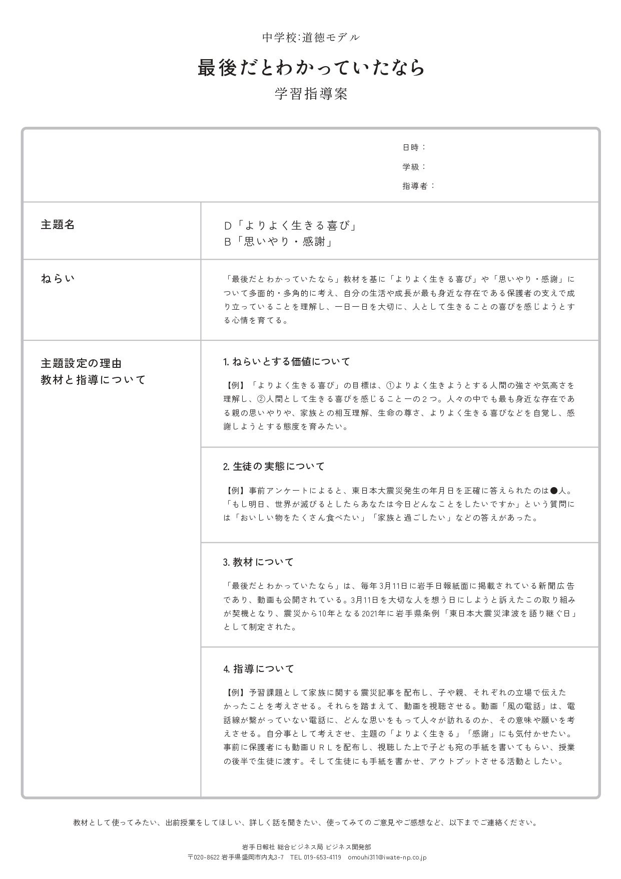 毎年、岩手日報社が「最後だとわかっていたなら」をテーマに掲載している新聞広告は、そばにいる人の大切さを伝える道徳教材として、全国の教育現場で使われていました。そこで2025年に、学校の先生方の協力のもと学習指導案をつくり、「公式の教材」として無償提供する取り組みを始めました。開始から1年が経ち、私たちの広告を使った教材は全国160以上の学校、自治体、団体などで導入されています。