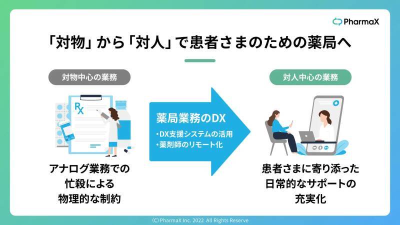 2022年8月にPharmaX株式会社へ社名変更し、薬局DXを推進していくことで患者さんに最も満足していただけるオンライン薬局モデル確立に向けて邁進する。