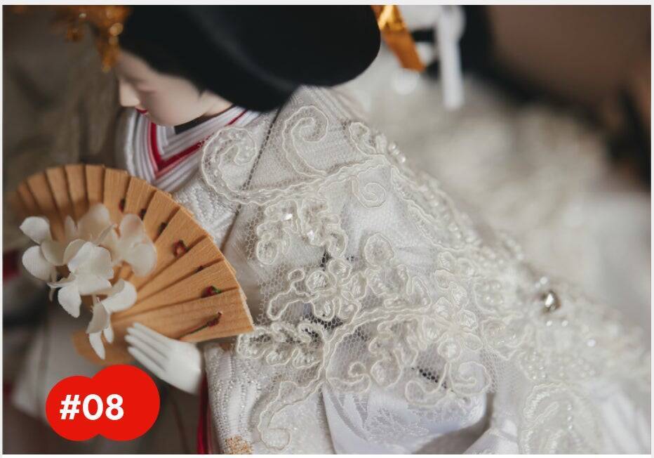 ヒントにしたのはトレンド。成人式の髪飾りやシンプルで落ち着きのあるインテリアも参考にした。さらには、「おひな様とおだいり様が真正面を向いているのが従来の配置でしたが、ほんの少し向かい合わせることで結婚式を迎える仲睦まじい2人を表現した」というものも。